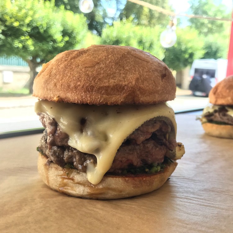 Steak haché grillé, Morbier AOP fondu, oignons caramélisés, sauce BBQ et pickles