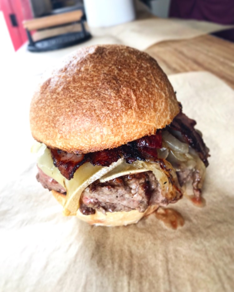 Steak haché, saucisse de Morteau grillée, Mont d’or fondu, oignons caramélisés et poivre concassé